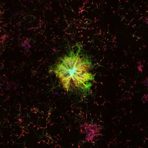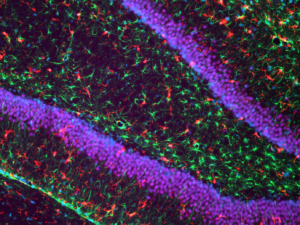 Microglia in red, astrocytes in green, and neurons in purple with blue used as a counterstain.
