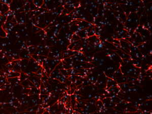 Neural stem cells differentiated in vitro towards neurons which form networks in a dish, with blue used as a counterstain.