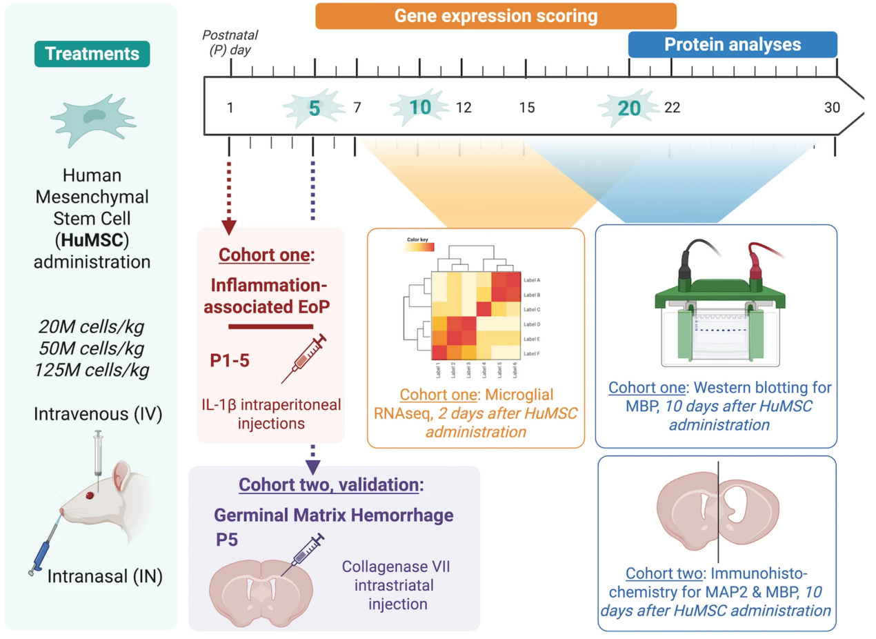 In this study, the researchers conducted comprehensive testing of dose, timing and route of administration, integrating multimodal data from preclinical models of brain injury common in preterm-born infants, to validate the most effective therapeutic option for the cord-derived mesenchymal stem cell product (HuMSC). They developed a scoring protocol based on microglia transcriptome analyses and myelin protein expression to evaluate the efficacy of the HuMSC product in a rat model of inflammation-associated preterm infant brain injury, with top results confirmed in a second model relevant to preterm infants, but with a different pathophysiology, namely germinal matrix haemorrhage.