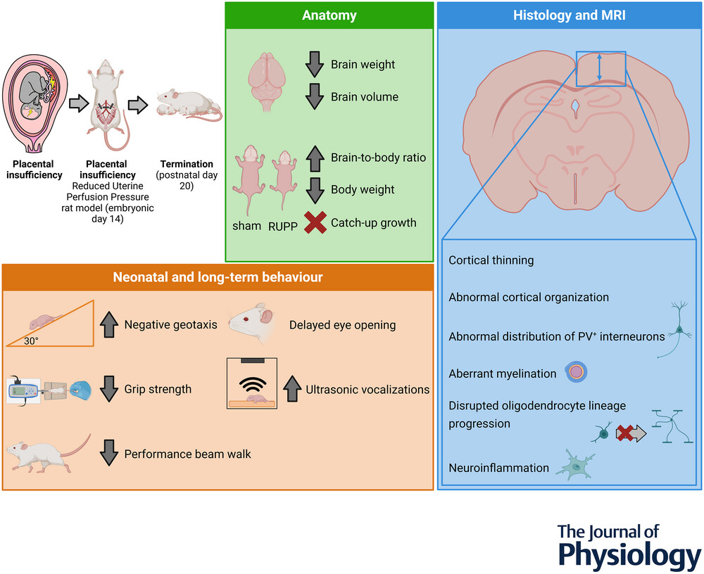 Foetal growth restriction (FGR) is a significant pregnancy complication strongly associated with neurodevelopmental deficits in infants. Effective treatments to support brain development are currently lacking. Detailed characterisation of structural and functional brain abnormalities caused by FGR can aid the development of targeted therapies. This study aimed to comprehensively characterise brain development at anatomical, cellular and functional levels in a rat model of placental-insufficiency-induced FGR, using the reduced uterine perfusion pressure (RUPP) method.